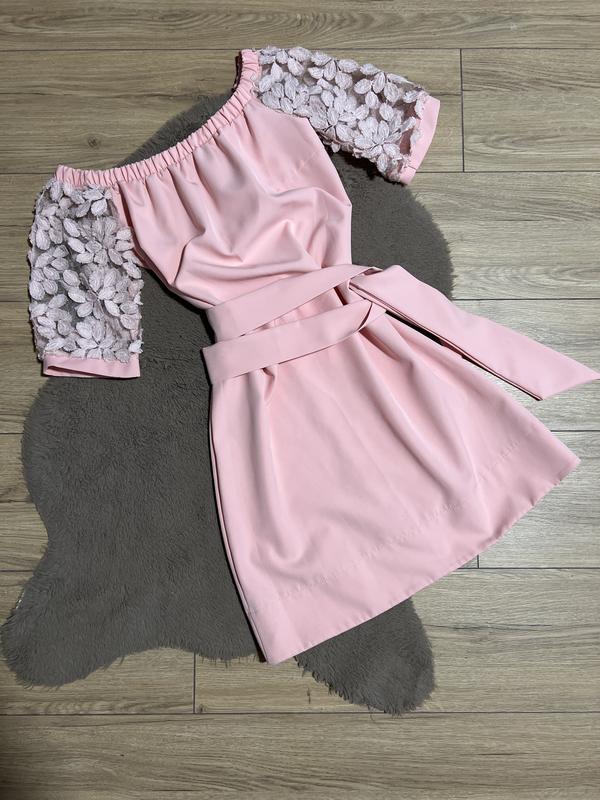 Святкова сукня з красивими мереживними рукавами.Ніжний персиковий колір. Сукня прямого крою, але в комплекті йде поясок, яким можна підкреслити талію. Зверху йде гумка, тому можна носити з відкритими плечима, або закритими. При покупці 2 речей - третя в подарунок 🎁