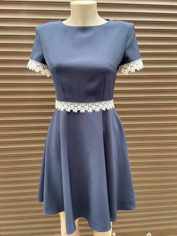 Плаття розширене. Темно-синього кольору. Довжина вище колін. Обшите мережкою))) Розмір 36,38,40