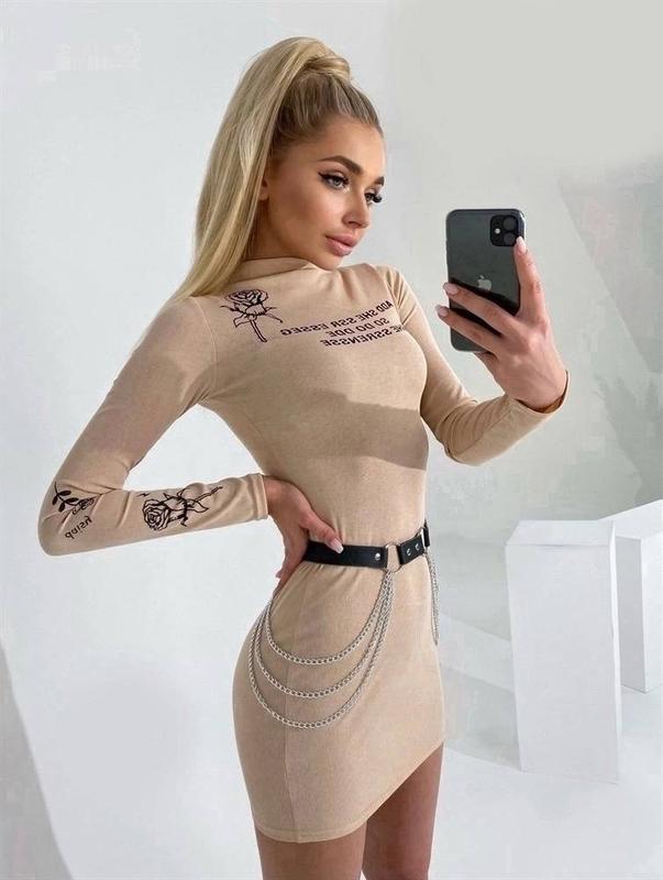 🔥РОЗПРОДАЖ 🔥 B O M B A! Яке ж воно круте! Силуетна сукня з тату принтом! Без ременю Капучіно 44-46 Бежевий 44-46