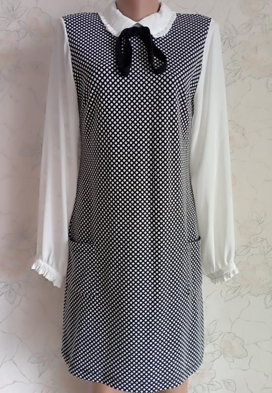 Фірмова , комбінована сукня у горох , з шифоновими рукавами , з кишенями та білим комірцем , плечі 36 , ПІГ 43-47 , ПІТ 40-44 , ПІБ 46-50 , рукав 60 , довжина виробу 86 .