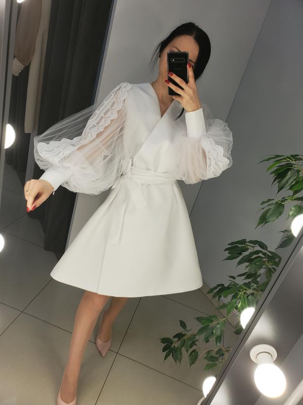 Шикарна сукня на запах з рукавами ліхтарик. З V- подібним вирізом. Широкі манжети на застібці. Сукня зі щільного матового атласу на підкладці. Розмір: S-M.