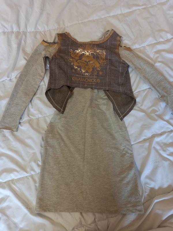 Плаття, складається з 2 елементів, звичайного базового сірого платтячка та топу з довгими рукавами , принтом спереду та розрізом ззаду (на фото добре видно ) дуже круто виглядає на тілі, зручне, тепленьке розмір S