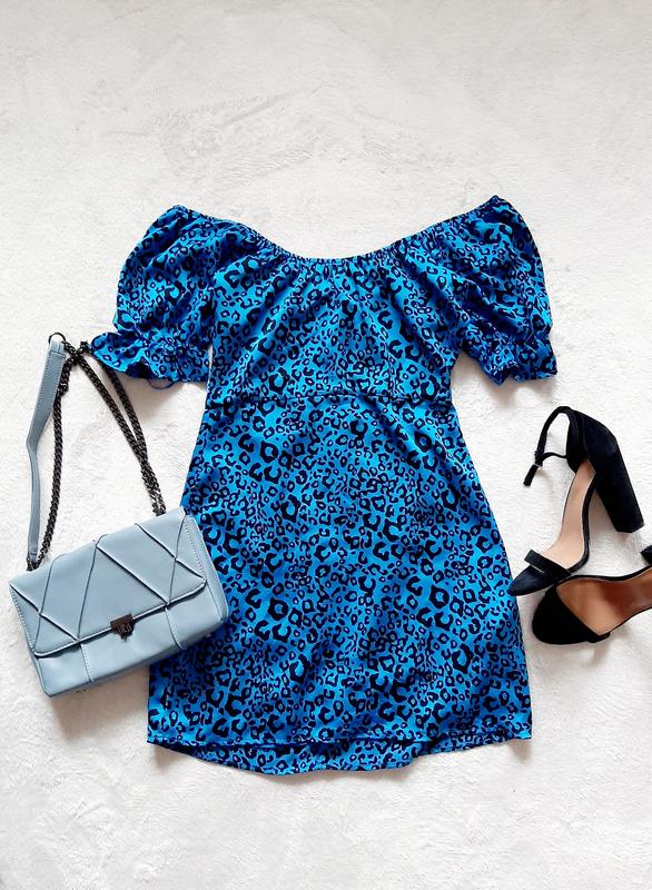 Плаття синього кольору ,довжини міні ,з опущеними плечима.Розмір XS-S.