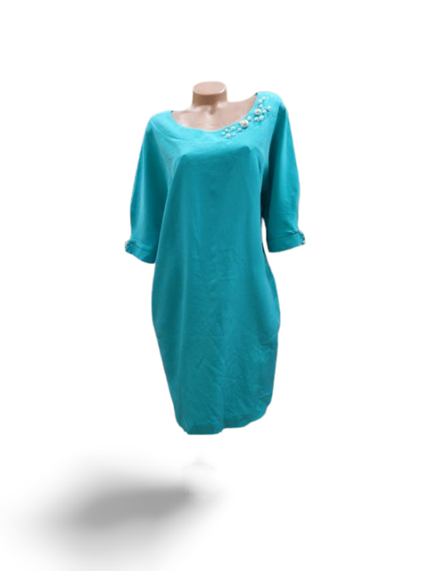 боковые карманы, по спинке внутренняя молния, бисер на клепках, сзади разрез, на рукавах маленькие разрезики в области бисера по манжету, глубокое платье для тех кому необходимо спрятать животик есть в цвете берюза и синий материал креп