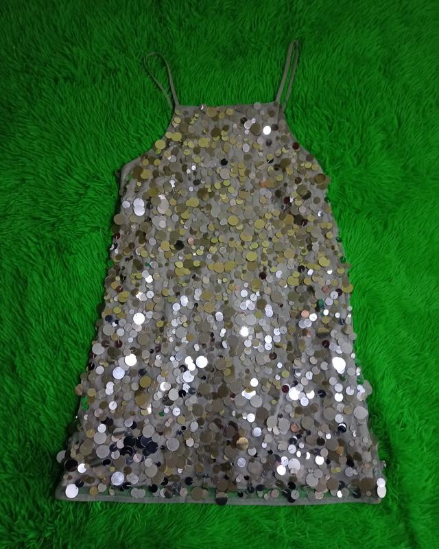 Чудова сукня у паєтках Стан 4/5 Є підкладка, зверху сітка з нашитими паєтками Довжина міні Знизу іде пошив колокольчиком Ззаду є застібка