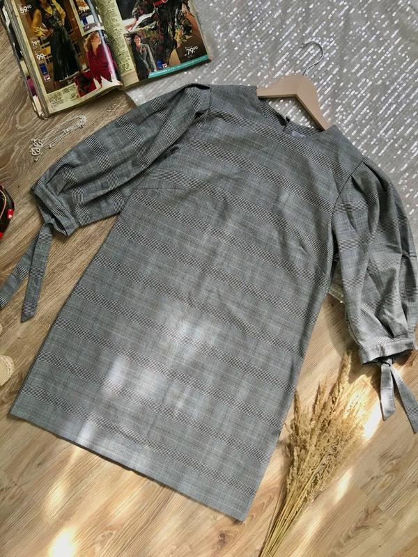 Коротке чорно-біло-червоне плаття з принтом в клітинку. Має цікавий рукав у три чверті.