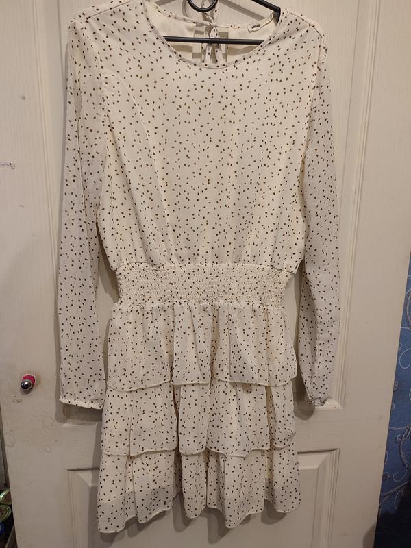 Сукня молочного кольору, в горошок. На талії резинка. Сзаду зав'язується.