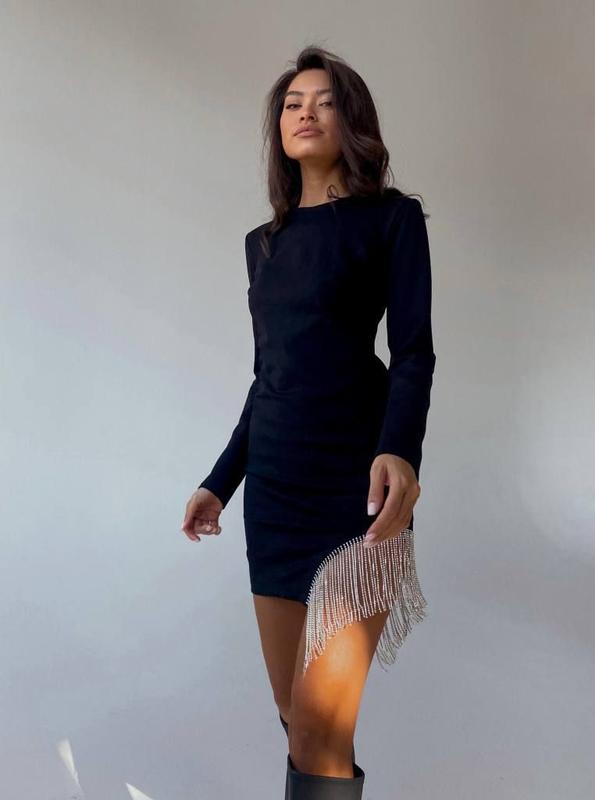 Модель 052/19 Розмір: 42-44, 46-48 Колір чорний Тканина: трикотаж Алекс Сукня, яка нікого не залишить байдужою❤️ Ідеальний варіант для вечірки, де ти сяятимеш, як справжня зірка🌿 На спинці потайна блискавка, металева бахрома.