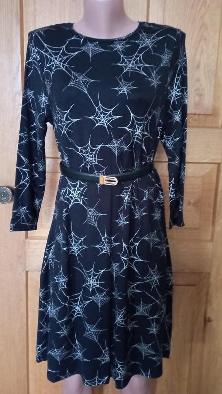 Нове плаття з принтом павутина, тканина тягнеться, приємна на дотик. Плечі 36, ПІГ 46, ПІТ 44, ПІБ 52, рукав 46, довжина виробу 90. Продається без ременя .