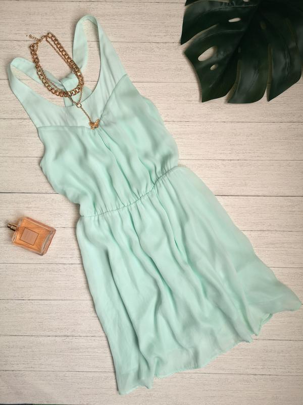 Шифонова сукня цікавого крою у м'ятному кольорі. Заміри: довжина від верхньої точки лямки до низу 85, ширина по грудях 41, ширина по поясу 30 (там резинка, тягнеться до 42), ширина по низу 78. Є підкладка, не світиться.