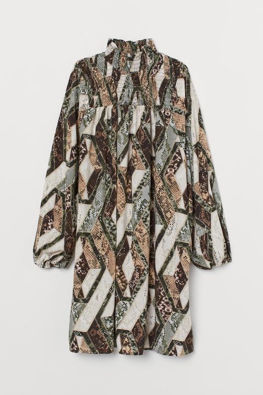 Короткое платье из ткани с присборенным воротником-стойкой и присборенной кокеткой. Длинные объемные рукава с узкой резинкой на манжетах.