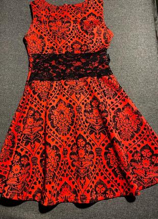 Сукня червона з чорним орнаментом з бархату, і гіпюровою вставкою, також є атласна стрічка для поясу. Заміри: Довжина 84 см Груди 40 см Талія 33 см