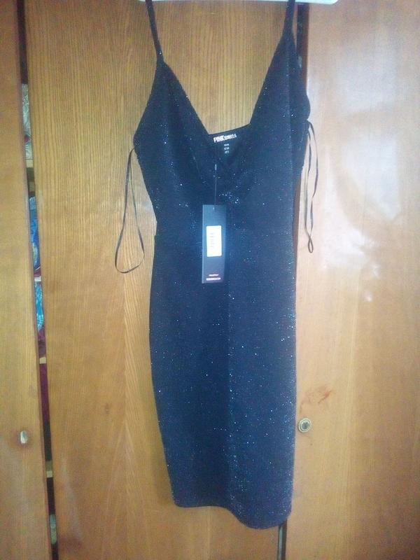 сукня чорного кольору з блиском, абсолютно нова з картонною біркою, має гарний вигляд декольте