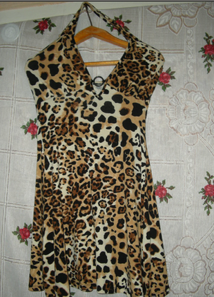 Сукня яскравою тигрового забарвлення,фірмове,95%віскоза,5%еластан,на грудях по центру плаття збирається на кільце,широка бретелька,що тримає сукню,одягається через голову,на талії плаття облягає,до низу йде клинами,об'єм талії-67см.,довжина сукні-94см.