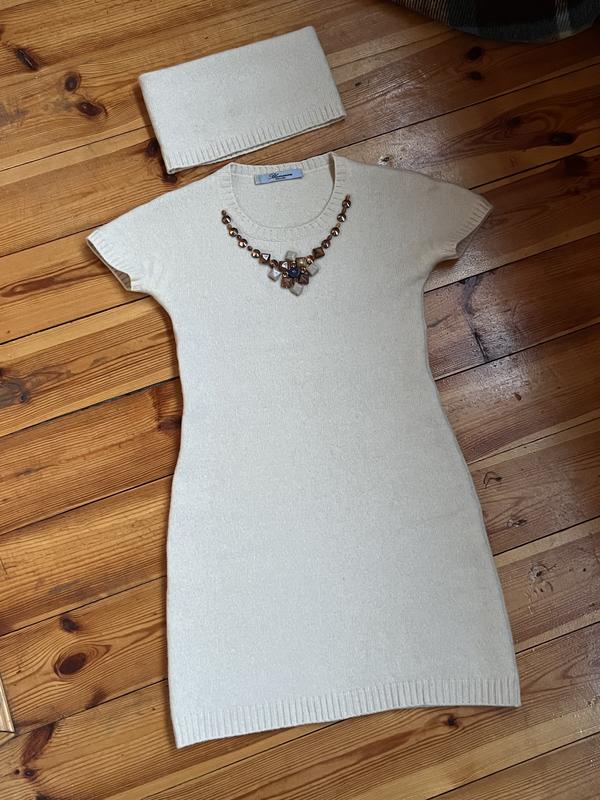 Брендовое платье от Blumarine молочного цвета Вязаное, теплое, на фигуре сидит очень красиво, воротник украшен камнями, есть сьемное горлышко в комплекте Размер С