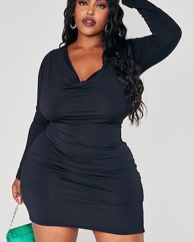 Черная мини-платье с длинными рукавами от Prettylittlething. С одной стороны маленький разрез. Ткань хорошо тянется. Размер 16/L-XL