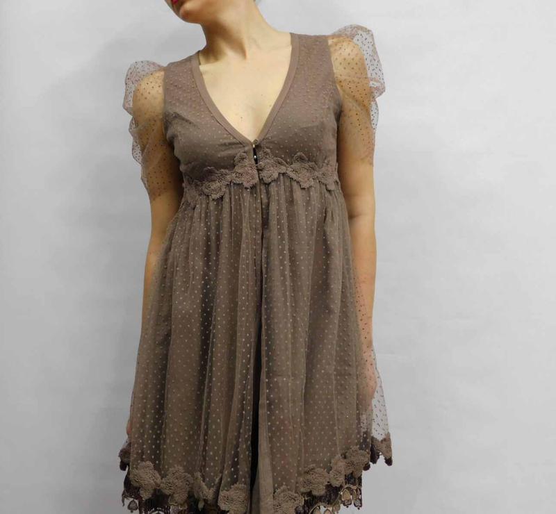 Дуже цікавий гарний кардиган в кольорі капучино (ближче до фото 2). Нижня тканина - жатий легкий хлопок, а зверху в тон сітка в горошок. Рукав злегка призібраний і піднятий, що дуже модно в цьому сезоні. Низ оздоблений мереживом і паєтками. Шикарна подіумна річ! Відмінно буде виглядати під вузькі брюки, джинси або короткі спідниці. Застібається на три гудзички на грудях. А ще, як варіант - його можна зашити від гудзиків і вийти дуже красива сукня Розмір вказаний 40, на наш 44 -46 буде. Ціна в Європі - 140 євро. бавовна -94% поліамід -6% поліестер -100% Довжина -94 см довжина рукава -31 см ПОГ -42 см ПОТ - 40 см ПОБІДИ - расклешено