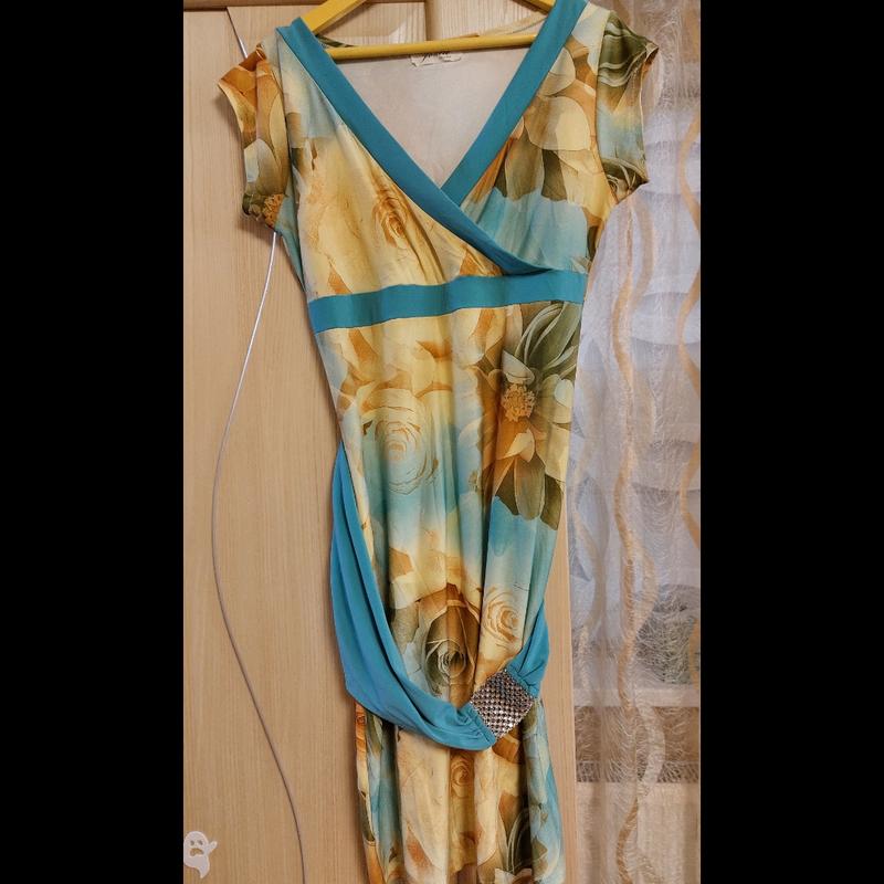 Ніжне плаття з вирізом на декольте та пояском. Довжина сукні 86 см, але ви самі можете регулювати довжину, у грудях 35 см. Тканина тягнеться. Має ефектний вигляд.