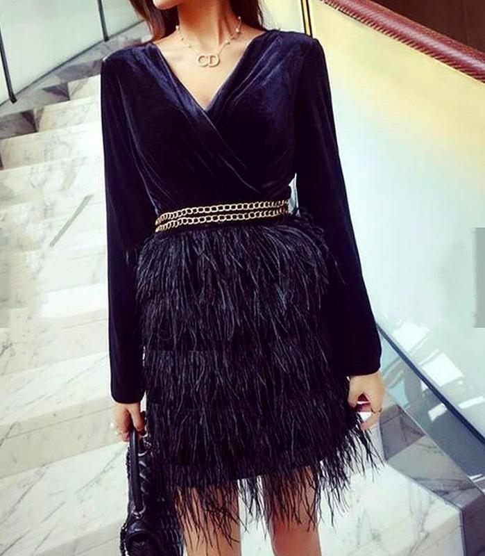 👆Бархатное платье украшено перьями и цепочками. Размеры : S, M, L Цвет - черный. Фабричный Китай 🇨🇳