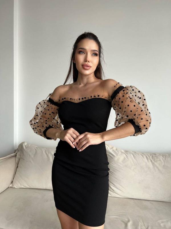 Сукня з об'ємними рукавами🥰 Модель or 466 Тканина: креп дайвінг, сітка в горошок Розміри: 42-44; 46-48 Кольори: чорний Сукня-футляр відшита зі стрейчевої тканини, яка ідеально лягає по фігурі, спущені об'ємні рукави з повітряної сітки підкреслять і відкриють плечі та ключиці Довжина міні 😍😍😍