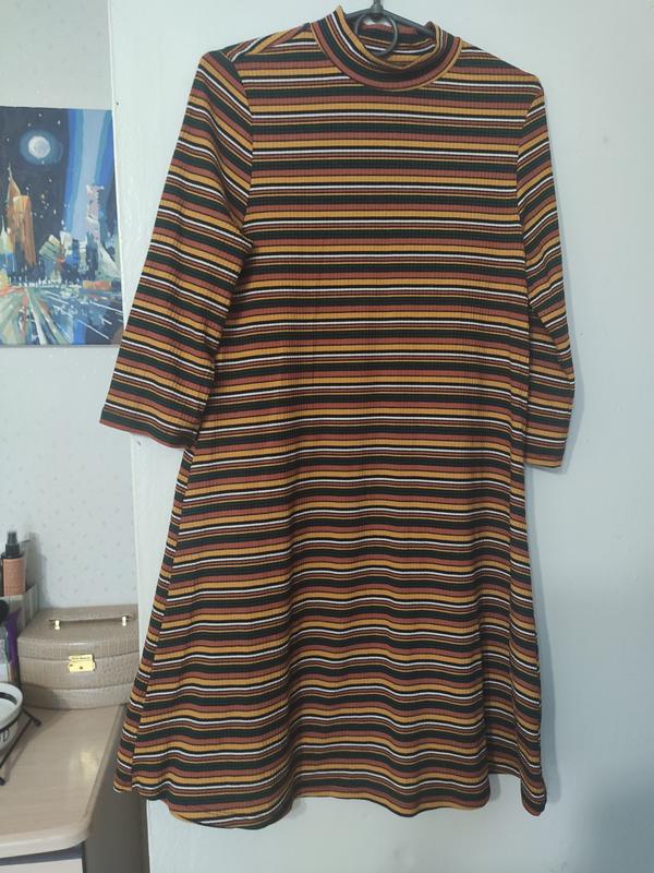 Дуже симпатична сукня в смужку насичених кольорів. Півобхват грудей 42 тягнеться до 60 Довжина 92 Ширина подолу 72