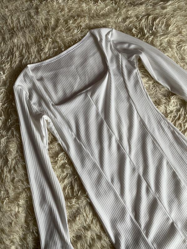 Платье белого цвета в рубчик, состояние новое, очень хорошего качества с квадратным вырезом, замеры более детально: Длина 81см Грудь 39см (тянется) Талия 35см (тянется) Бедра 40см (тянется) Рукав 65см
