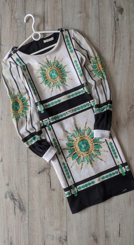 Яскрава сукня, розмір S,повномірний. Тканина тягнеться, добре лягає по фігурі. Довжина 89 см. рукав 60 см. Ззаду на замочку, рукава прозорі.