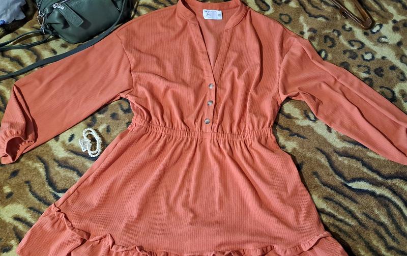 короткое платье с длинными рукавами внизу на резинке, рукав приспущен, в низу платье рюша, ткань лёгкая, цвет у платья как светлый кирпич. размер указан 14, хорошо будет смотреться на невысокой девочке. пог 54 поб свободный длина платья 80 см длина рукова 48 если нужны доп фото пишите