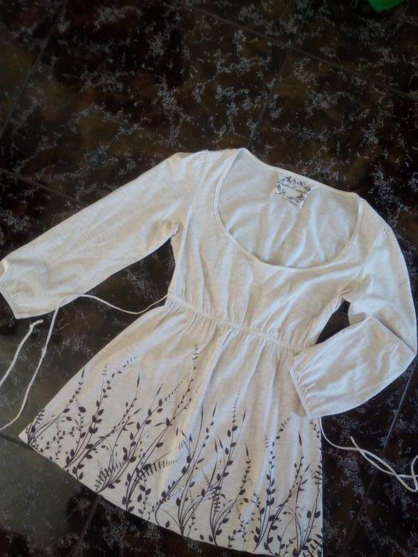 Туніка кремового кольору з квітковим принтом. Рукав 7/8. Завищена лінія талії, на гумці, поясок ззаду. З дефектів: на паску з однієї сторони розійшлися шви. ПОГ 40 см, довжина 69см, ПОБІДИ 58см. Підійде на наш 40 - 42 розмір.