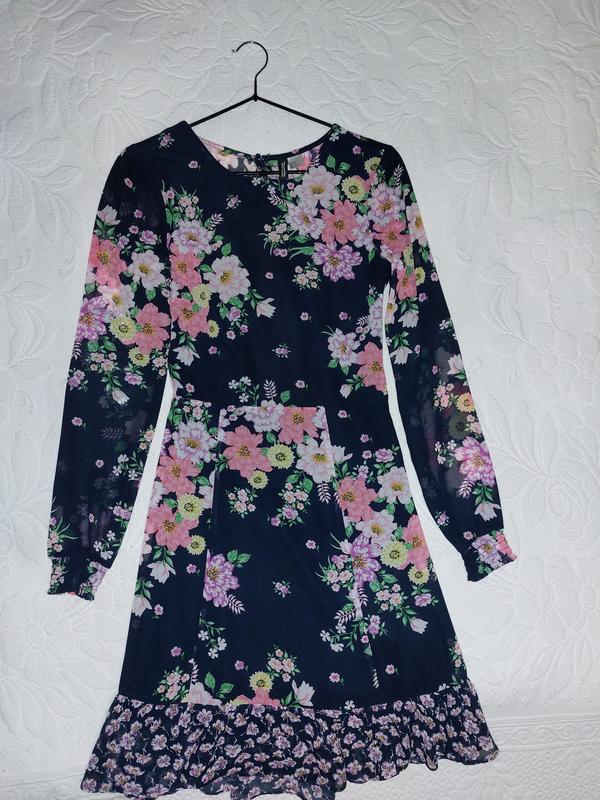 Платье Divided 36, легкое платье темно-синего цвета в цветочки, с длинным рукавом, и открытой спиной, длина 87, талия 32, рукав 60