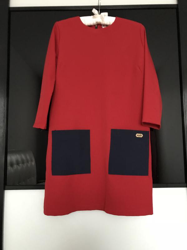 Плаття червоного кольору з темно-синіми кишеньками,ззаду на замочок,на фото вийшло трохи темніше,ніж у реальності