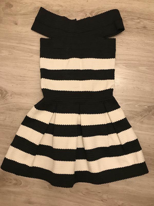 Утягивающее короткое черно-белое платье-резинка с пышной юбкой и возможностью регулировать верх - приспускать на плечи. Сзади вдоль всей спины молния. Состояние идеальное, одевалось раз. Размер с.
