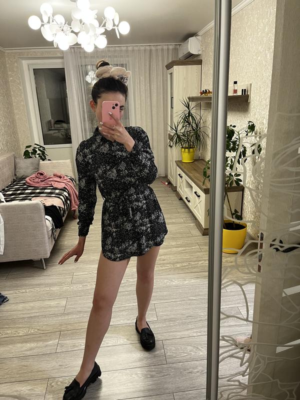 Маленька чорна сукня-сорочка ( в білу крапочку ) Коротка сукня, рукав якої при бажанні можна зробити коротшим (є застібка на рукаві). Зріст моделі: 168 см., Обхват грудей: 83 Обхват талії:64 Бедра:90