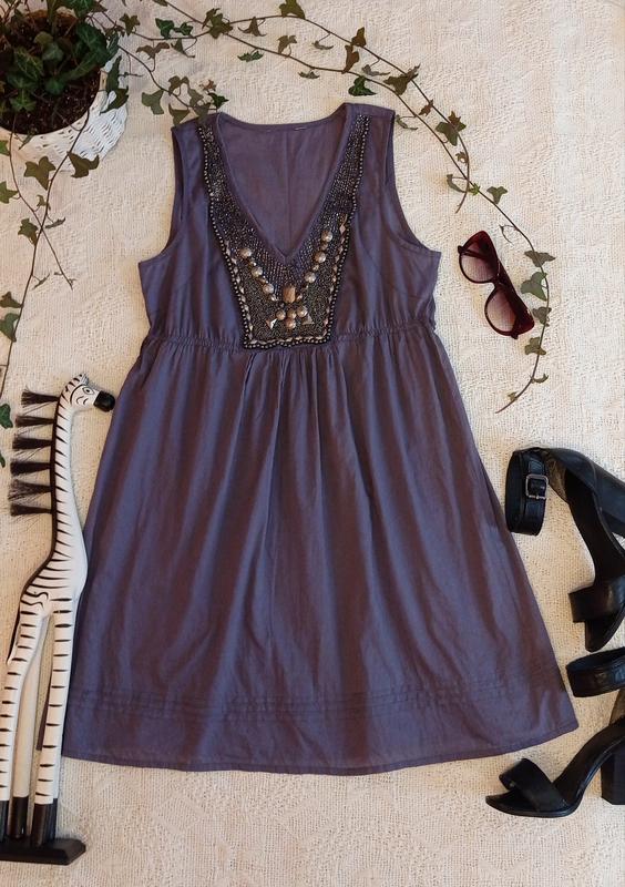 Легка натуральна сукня з металевим оздобленням, талія завищена. Довжина 83см, талія 84см, груди 90см.