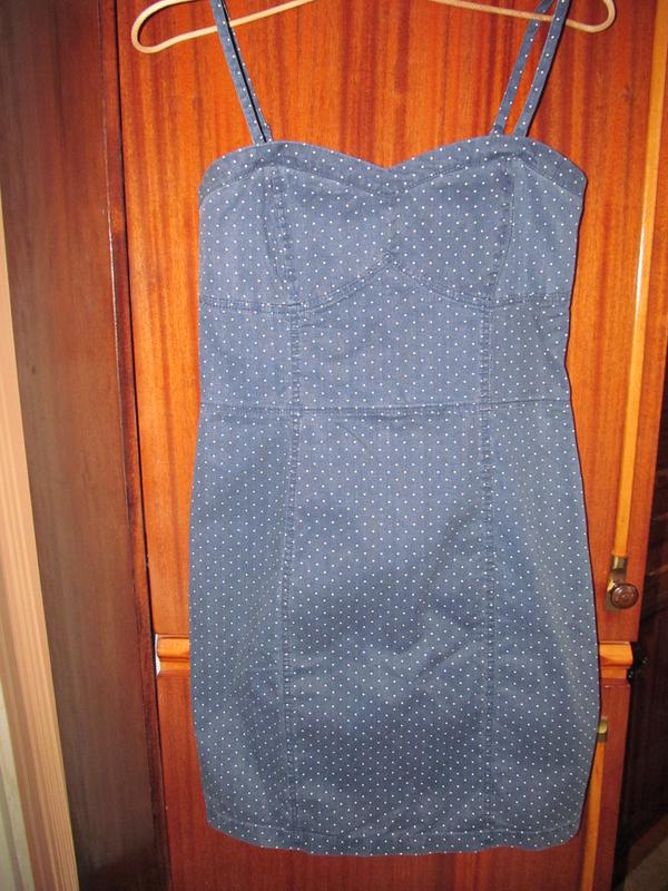 Джинсовий сарафан в горошок , Р L. ПОГ-40/47, пот-40/43 , поб-52/55 , довжина без бретель70 см+ 17 см бретелі, регулюються, тобто вся довжина-87-88 У складі 97% котон, 3-спандэкс.