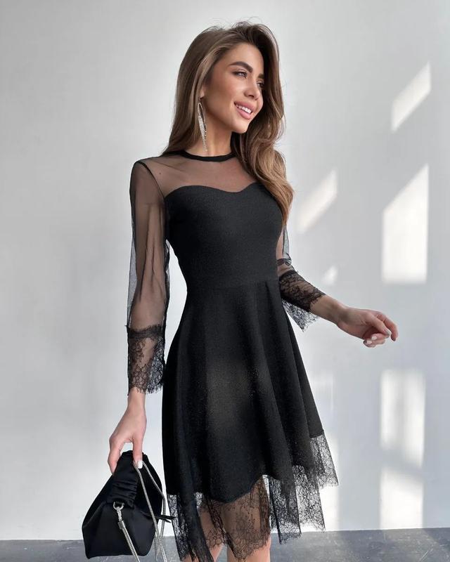 5808 🧚‍♀ Тканина: трикотаж люрекс, м'яка сітка, дороге мереживо Розміри: 42-44, 46-48 Колір: Чорний, Сріблястий Ціна: 680 грн. У цій сукні  ви обов'язково станете зіркою вечора 🥂 Тканина гарно переливається, незвичайний рукав з сіткою і мереживом зробить ваш образ максимально романтичним 😍 Реальні фото ✔️