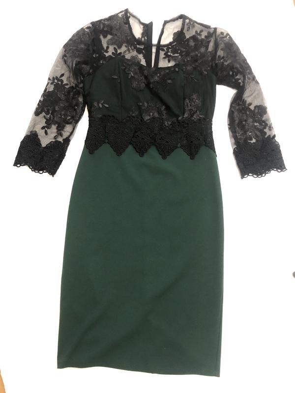 Изумрудное платье украшено черным кружевом, рукав 3/4, имеет чашечки, можно одевать без бюстгальтера.