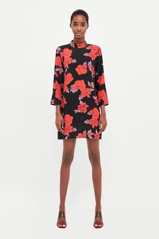 Zara – короткое цветочное платье. Платье из воздушной вискозы прямого кроя, с устойчивым воротником и молнией сзади, скрытой в подоле. Имеет яркий цветочный принт. Выглядит очень красиво. 100% вискоза. Стан - идеальный. Размер по набору M.