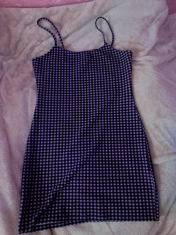 У чорно-фіолетову клітинку. Гарно сидить на фігурі, вдягала один раз. Довжина 66см без шлейок
