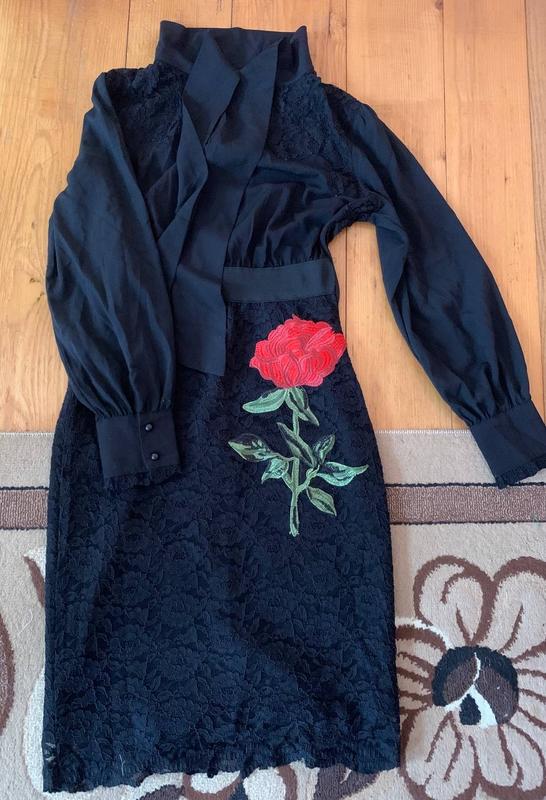 Плаття виглядає як костюм,верх-шифон з кружево під шиєю завязуєтся,на ґудзиках ,пояс-резинка,спідниця-кружево з нашитою квіткою