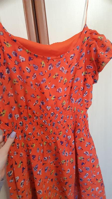 помаранчева сукня з квітковим принтом. є підкладка,довжина 80, пів обхват талія 33,на резиночці, пів обхват груди 44