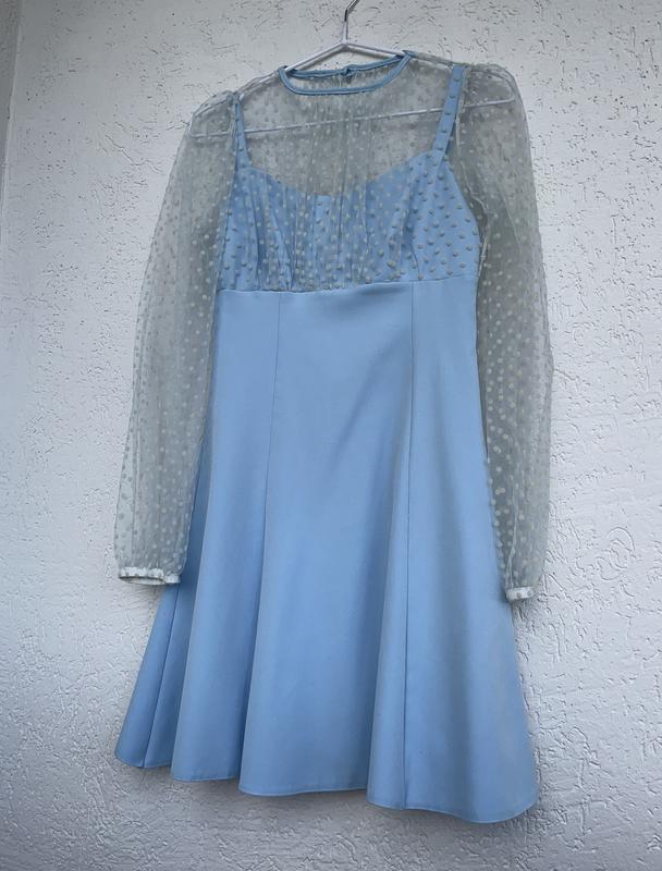 Романтична блакитна сукня, довжина міні, об‘ємні рукави з ніжкої на дотик сітки в горох.
