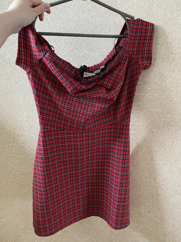 Платье красное в клетку на приспущенные плечи