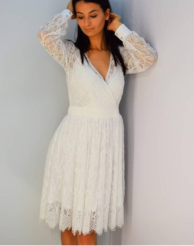 Розкішна гіпюрова сукня з v - подібним вирізом горловини, довгий рукав з манжетами на гудзиках, по лінії талії широкий пояс. Вишукана та ніжна, шикарний набивний візерунок гіпюру. Потаємна застібка-блискавка в боковаму шві. Матеріал: поліестер, віськоза.