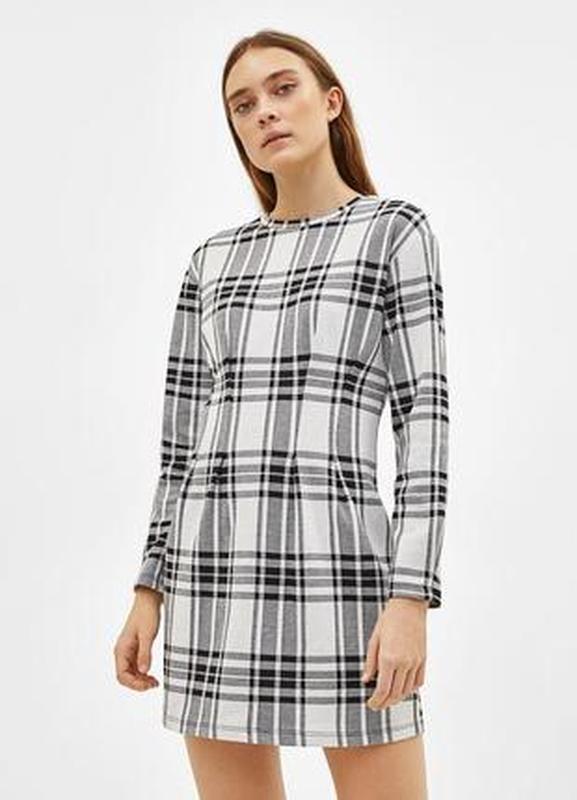 Сукня із защипами на талії в клітинку. Матеріал: віскоза з поліестером. Тканина щільна і добре тримає форму. Розмір L. Заміри: ширина в плечах 48см, пог 45см, пот 40см, пот 46см, довжина 78см.