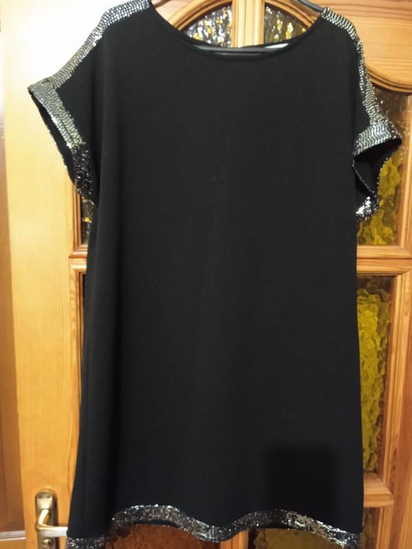 Плаття вільне з блискучим оздобленням, скриває живіт завдяки вільному крою. Довжина 88 см, ПОГ 57, ПОБ 58, ПОТ 58, низ 59. Без дефектів.