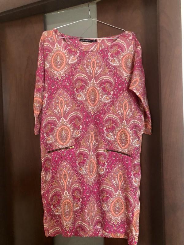 Сукня Zara, вільного прямого крою. Принт- щось на кшталт «турецький огірок».Є кармани» обманки», оформлені металевою «блискавкою».Стан хороший. 💕Розмір М. 💕Довжина - 89 см. 💕Під пахвами- 56см. 💕Поб - 53 см.