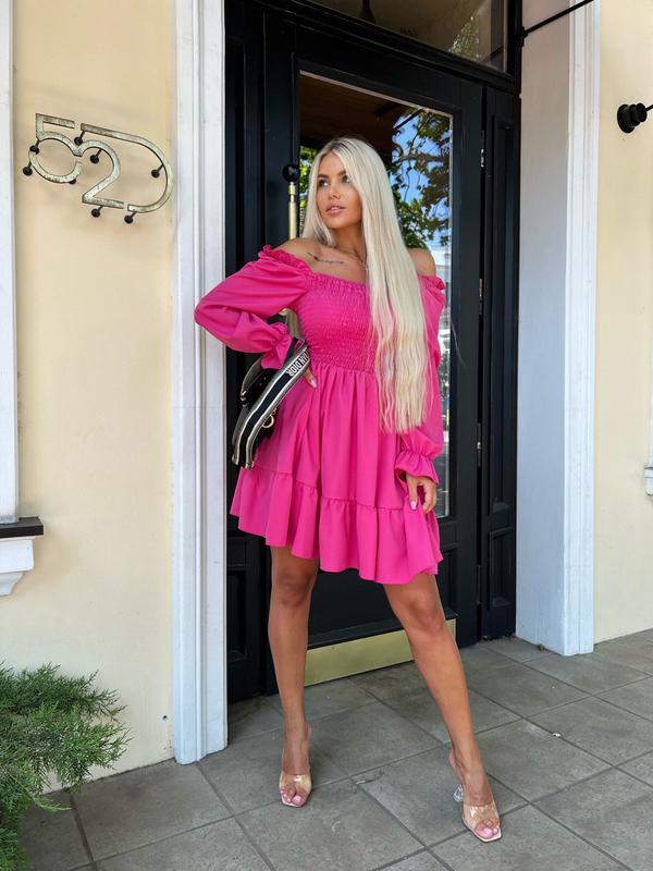 Сукня 😍😍 📌Розміри: S, M, L, XL 📌Тканина: софт, приємний на дотик 📌Кольори: блакитний, беж, лаванда, малина, трава та чорний Модель дуже стильна, легка, ідеально підійде під різне взуття, зі стильною в цьому році настрочною резинкою по грудях. Супер якість