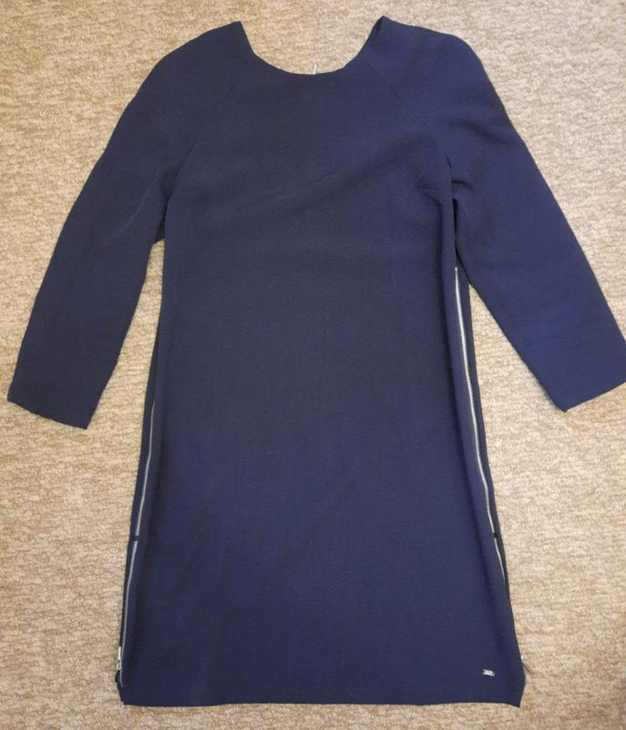 Платье прямого кроя. Очень красиво смотрится за счет молний. Рукав 3/4