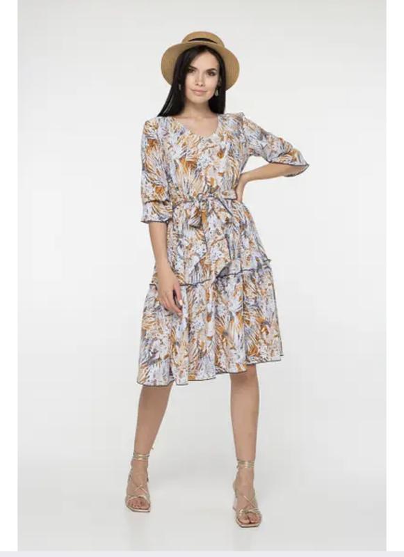 Легкое, нежное воздушное платье с поясом. Платье свободного силуэта, трапеция к низу. Короткий рукав усобран на резиночку, что позволяет регулировать его длину. Тканина креп катон. Принт - растительная абстракция Размерный ряд: XS ⁇ S>M>L>XL>2XL